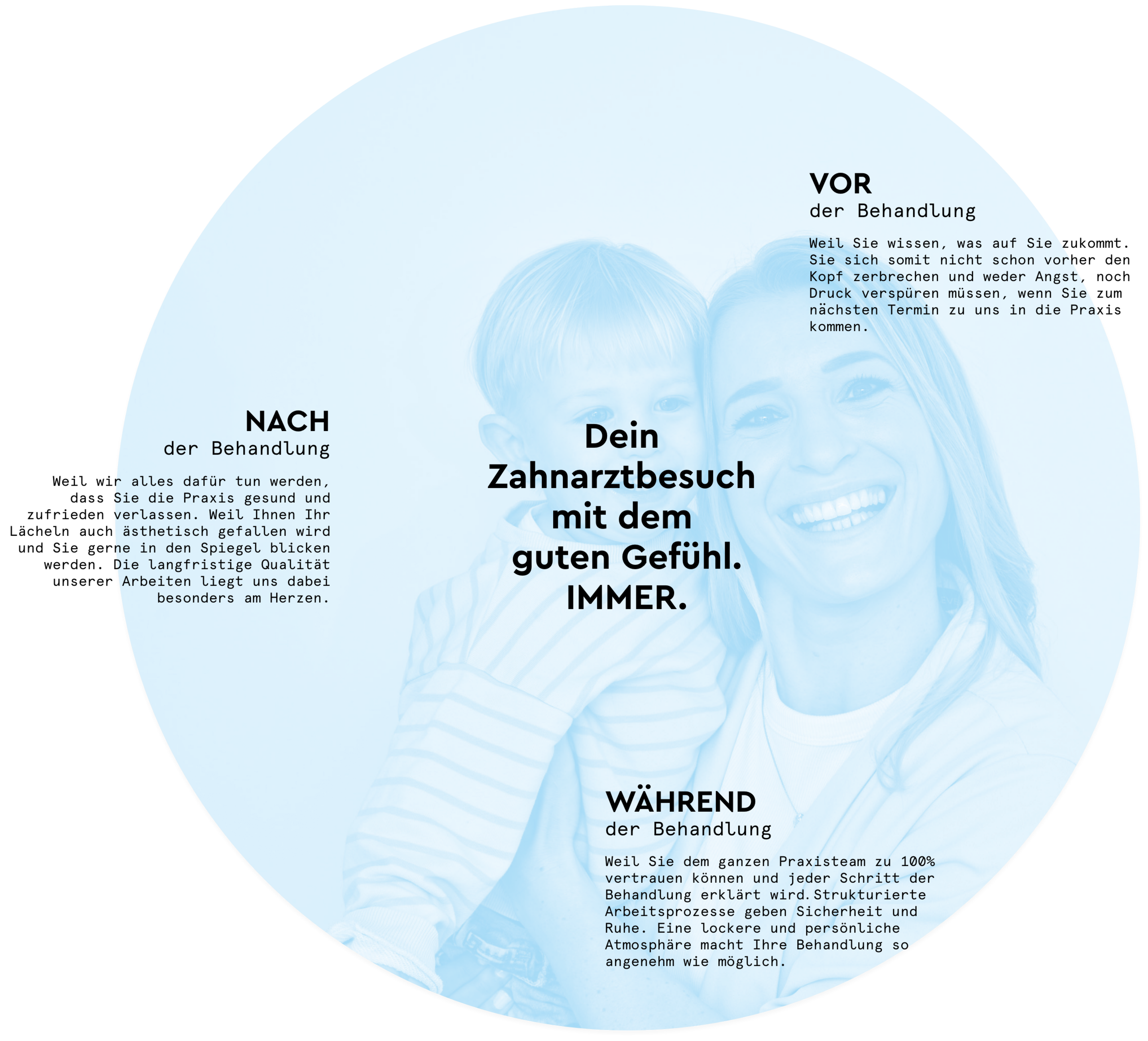 Weil Sie dem ganzen Team unserer Zahnarztpraxis zu 100 % vertrauen können und jeder Schritt der Behandlung erklärt wird. Strukturierte Arbeitsprozesse geben Sicherheit und Ruhe. Eine lockere und persönliche Atmosphäre macht die Behandlung durch Ihren Zahnarzt so angenehm wie möglich.